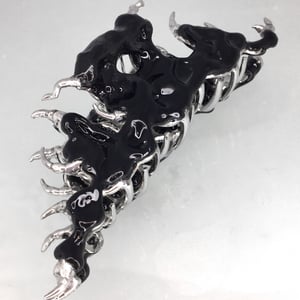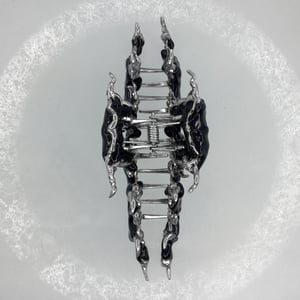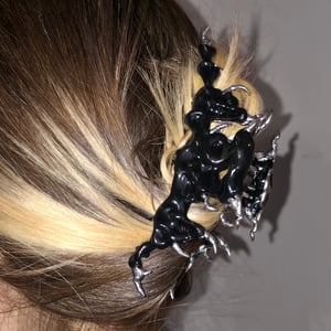 A hair pin with spikes made of tin and a design made of polymer resin coated with varnish. It has a tight spring and holds the hair well.