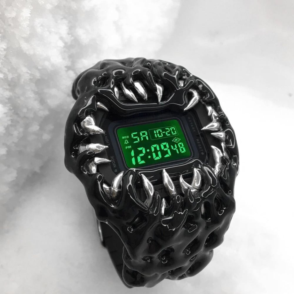 Watch with polymer and pewter design. Alarm clock, stopwatch, date, backlight and water resistance. The watch comes in a metal case.
