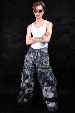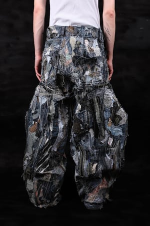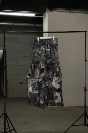 - Improvisation of a destructive patchwork overlay of denim from more than 10 large flaps of denim among themselves