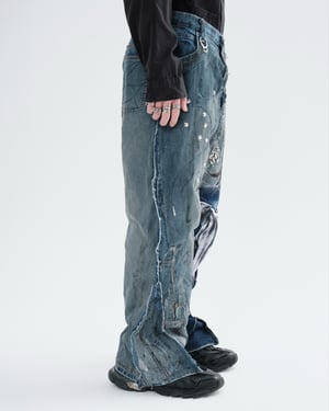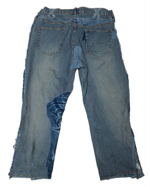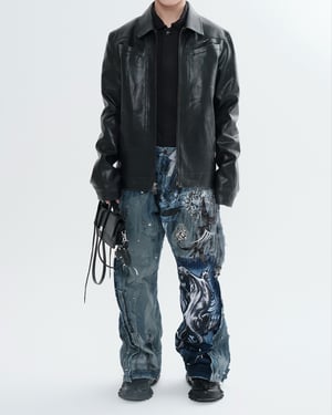 Classic-cut jeans with a slightly wide-leg silhouette. Left leg adorned with a print of a wild panther and abstract patchwork, while the right leg features an abstract tribal design, numerous metal studs, zippers, distressed accents, and zigzag stitching. Zipper and button closure. Metal hardware, including the fastening, button, and zipper.