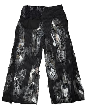 Dense classic suit trousers in a deconstructed style. The patchwork appliqué is fixed with hundreds of white vertical threads and made from printed cotton, lace tulle, fabric scraps in a stripe pattern, and white labels. There is a sewn-in pocket at the back and numerous zigzag stitches. Medium rise and wide silhouette. Metal fastening, button, and zipper.