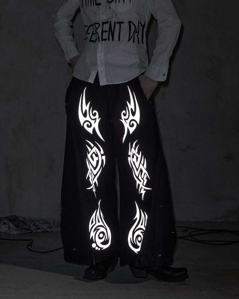 Wide black trousers made from 3 pairs. Abstract reflective straps in the shape of a leg skeleton are used on the front. Very wide silhouette to the bottom. Button and zipper fastening. More than 28 hours of meticulous work were required to create the model.