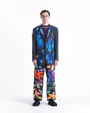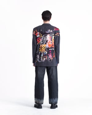 Vintage navy blazer designed with abstractions collaged front and back. Made by hand. Brand logo printed inside.