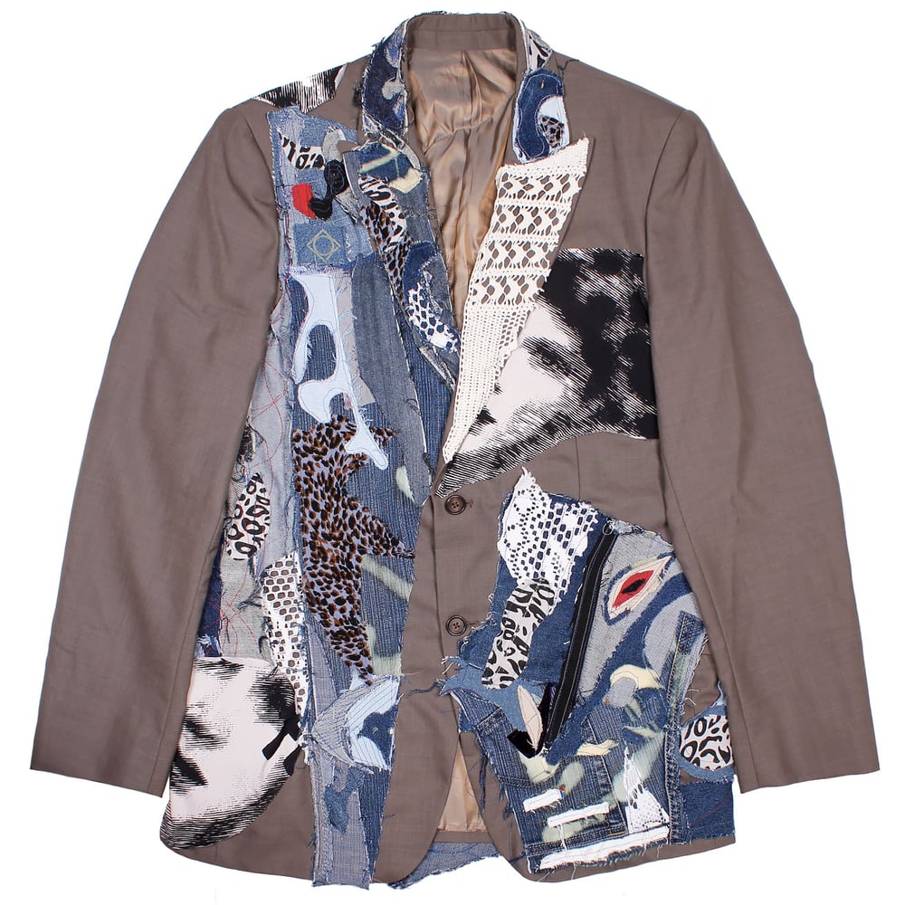 Vintage grey blazer designed with patchwork, collaged with mixed fabric and embroidery stitches. Made by hand. Brand logo printed inside.