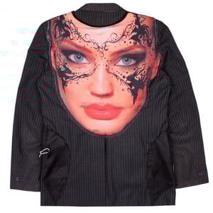 Vintage dark grey blazer designed with tactical utility vest with chains. Face print sewed on the back. Made by hand. Brand logo printed inside.